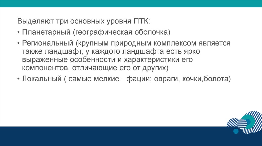Выделяют три основных уровня ПТК:• Планетарный (географическая оболочка)