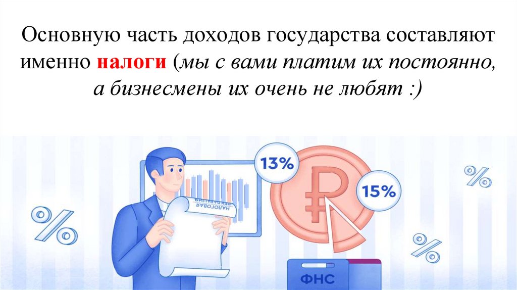 Основную часть доходов государства составляютименно налоги (мы с вами платим их постоянно,