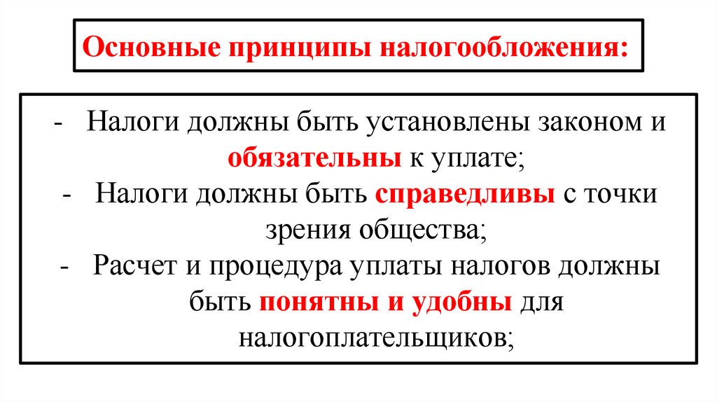 Основные принципы налогообложения:- Налоги должны быть установлены законом и