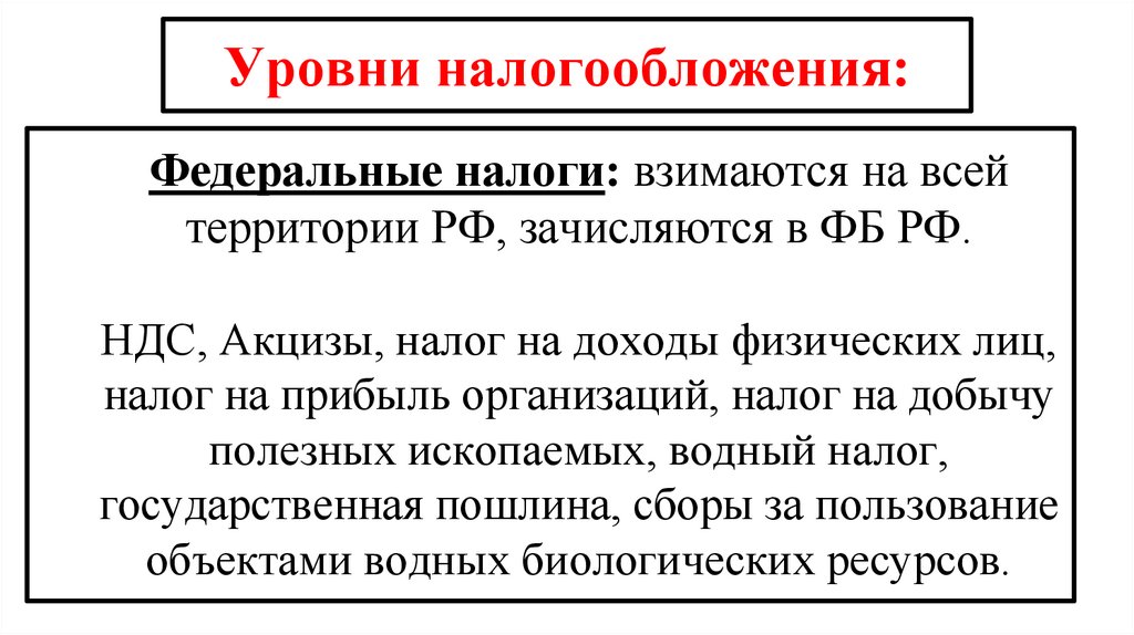 Уровни налогообложения:Федеральные налоги: взимаются на всей