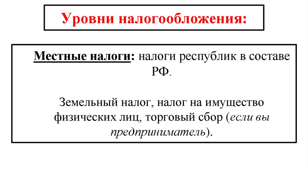 Уровни налогообложения:Местные налоги: налоги республик в составе