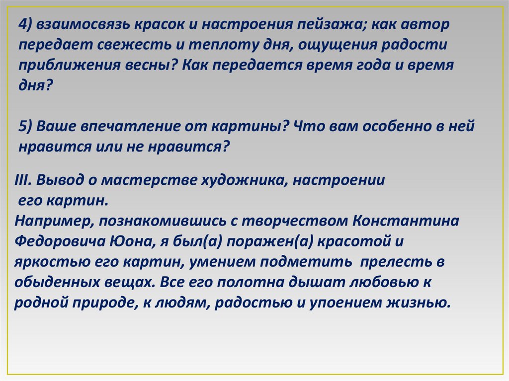 4) взаимосвязь красок и настроения пейзажа; как авторпередает свежесть и теплоту дня, ощущения радости