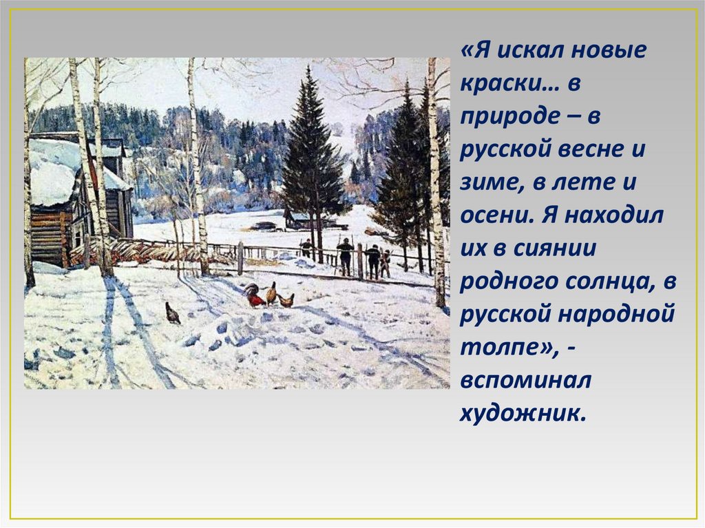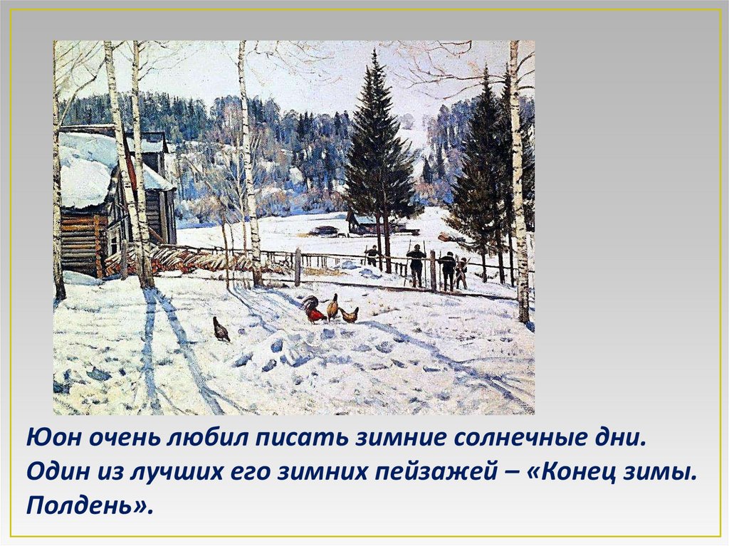 Юон очень любил писать зимние солнечные дни.Один из лучших его зимних пейзажей – «Конец зимы.