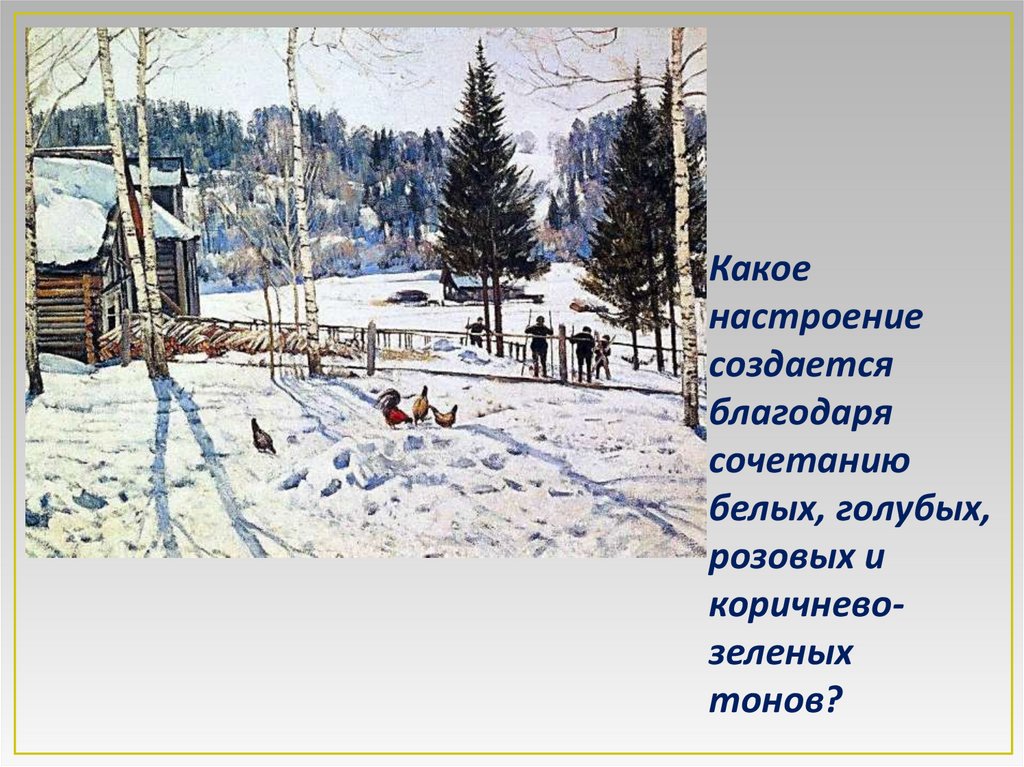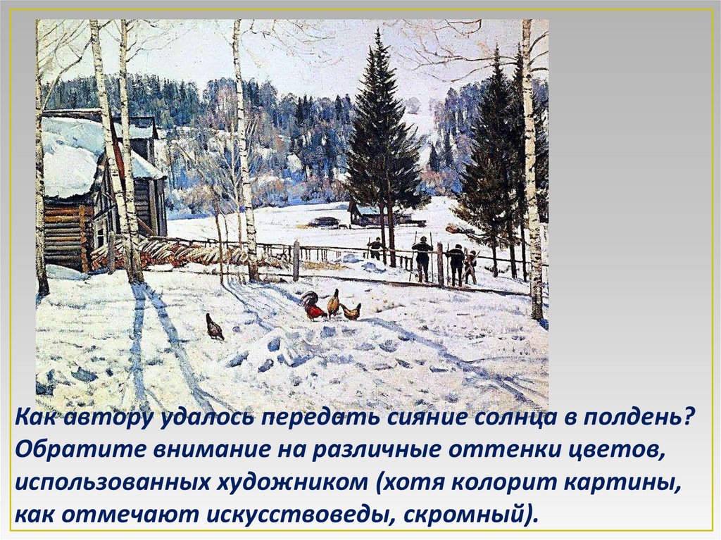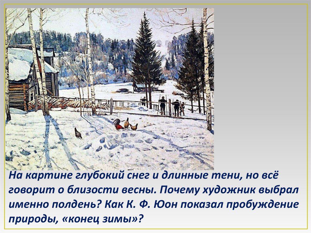 На картине глубокий снег и длинные тени, но всёговорит о близости весны. Почему художник выбрал