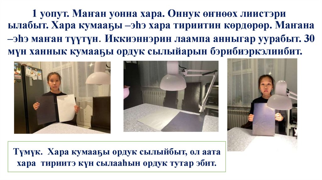 1 уопут. Маҥан уонна хара. Оннук өҥнөөх лиистэриылабыт. Хара кумааҕы –эһэ хара тириитин көрдөрөр. Маҥана