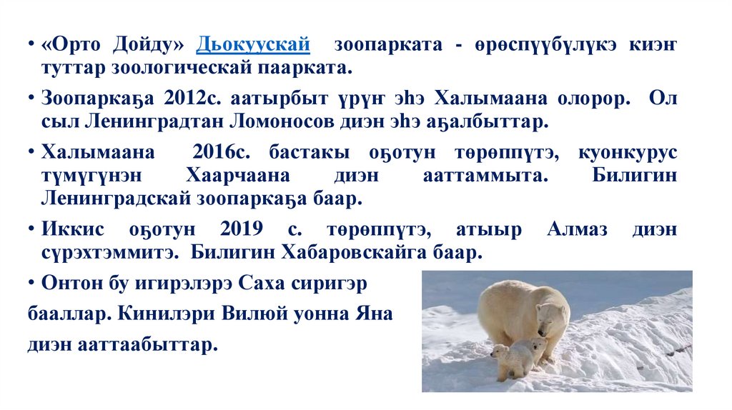 • Зоопаркаҕа 2012с. аатырбыт үрүҥ эһэ Халымаана олорор. Ол