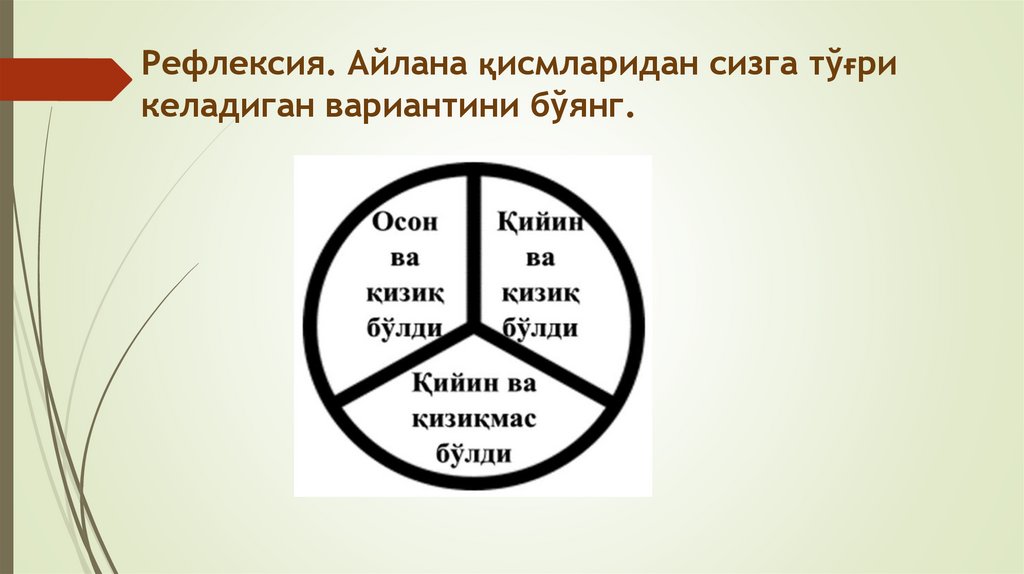 Рефлексия. Айлана қисмларидан сизга тўғрикеладиган вариантини бўянг.