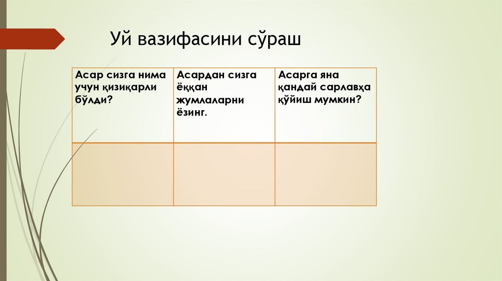 Уй вазифасини сўрашАсар сизга нима Асардан сизга