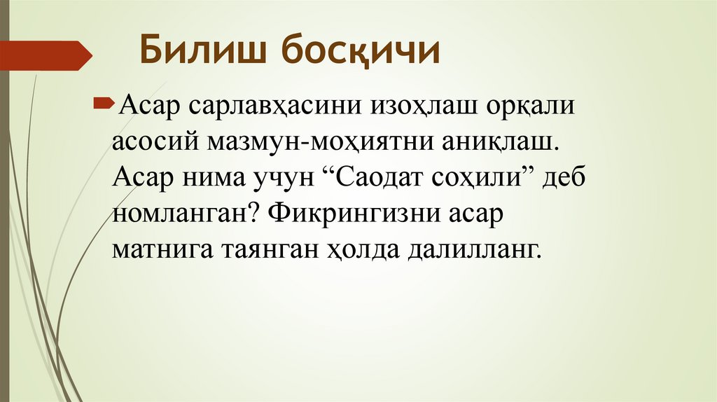Билиш босқичиАсар сарлавҳасини изоҳлаш орқали