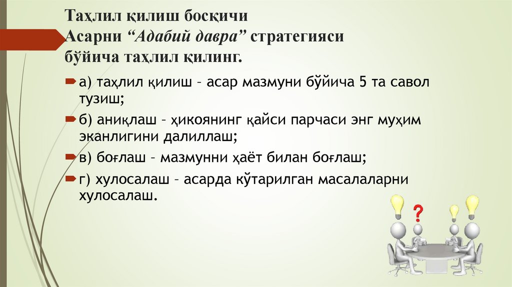 а) таҳлил қилиш – асар мазмуни бўйича 5 та савол