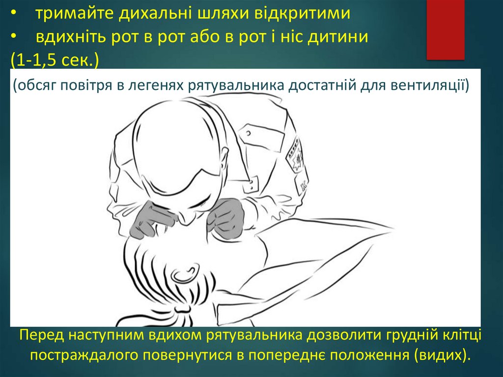 • тримайте дихальні шляхи відкритими• вдихніть рот в рот або в рот і ніс дитини