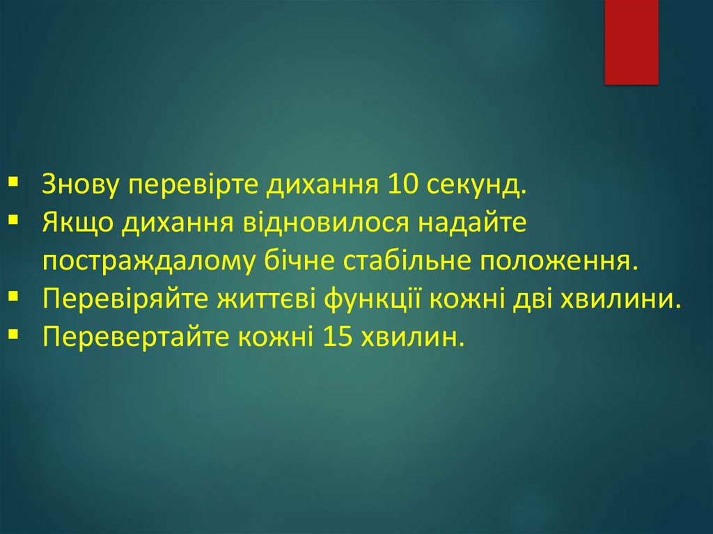 Знову перевірте дихання 10 секунд.Якщо дихання відновилося надайте
