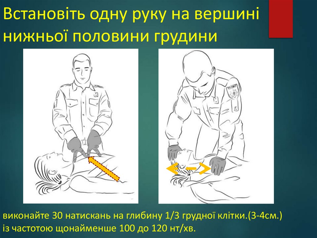 виконайте 30 натискань на глибину 1/3 грудної клітки.(3-4см.)із частотою щонайменше 100 до 120 нт/хв.