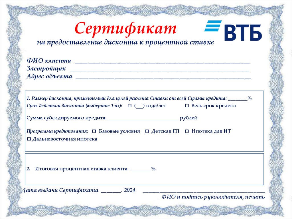 ВТБ. Сертификат на предоставление дисконта к процентной ставке