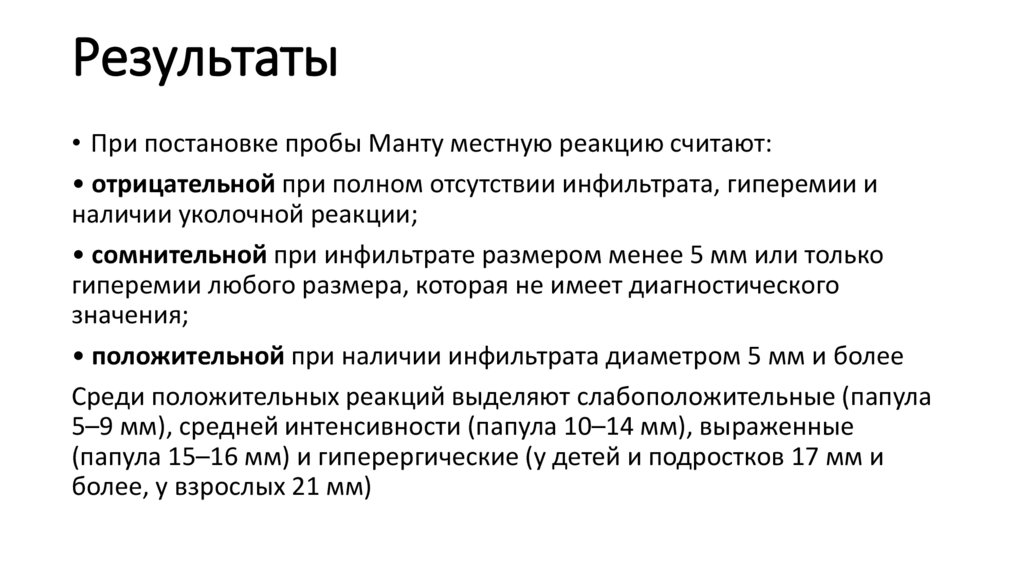 Результаты• При постановке пробы Манту местную реакцию считают:
