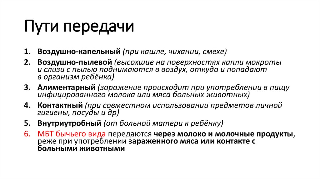 Пути передачи1. Воздушно-капельный (при кашле, чихании, смехе)