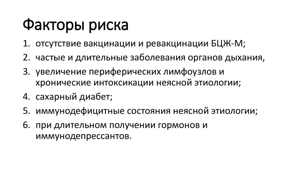 Факторы риска1. отсутствие вакцинации и ревакцинации БЦЖ-М;
