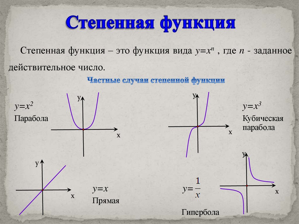 Степенная функция – это функция вида y=xn , где n - заданноедействительное число.