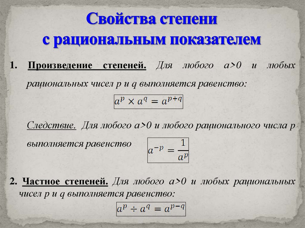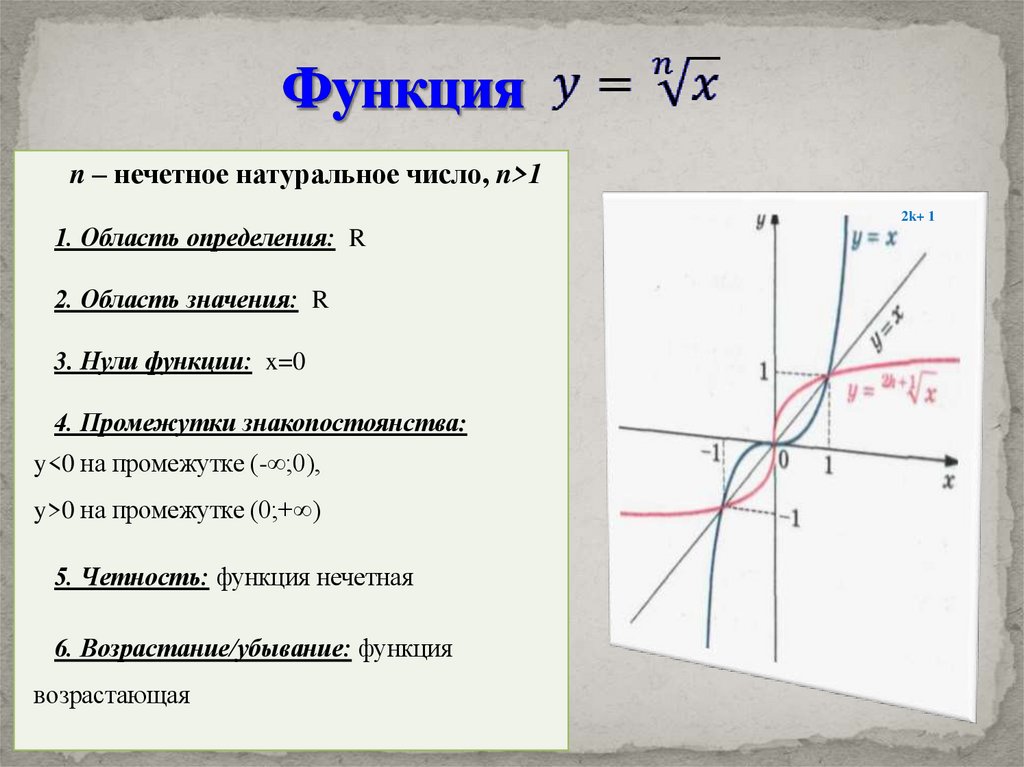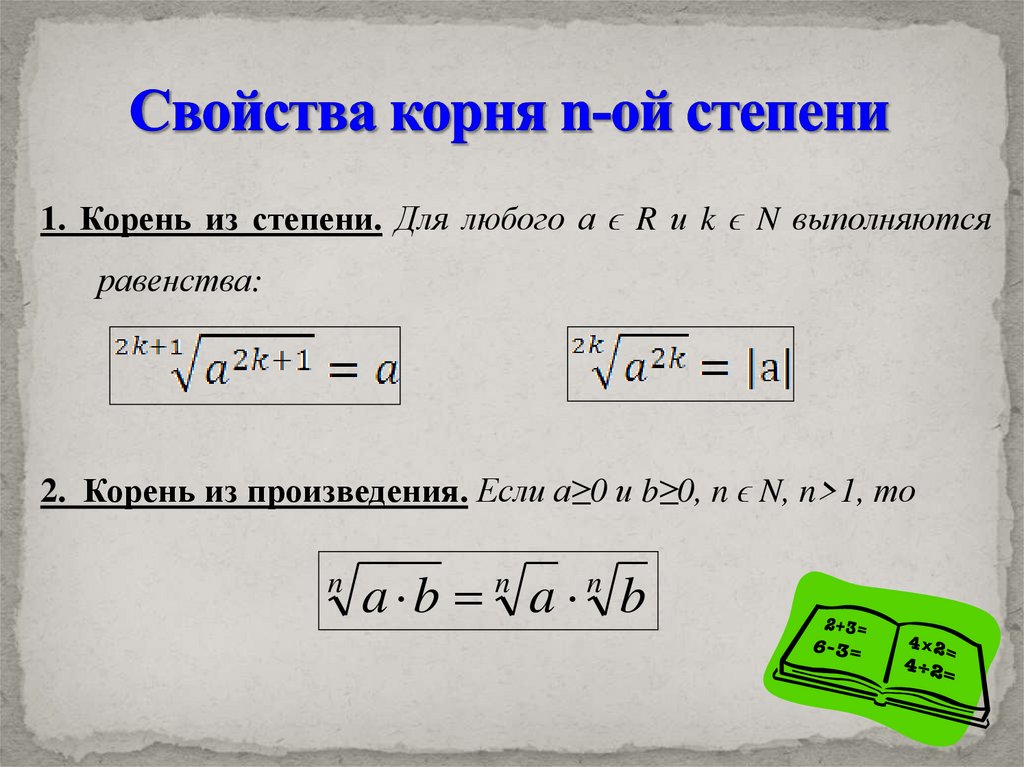1. Корень из степени. Для любого а ϵ R и k ϵ N выполняютсяравенства: