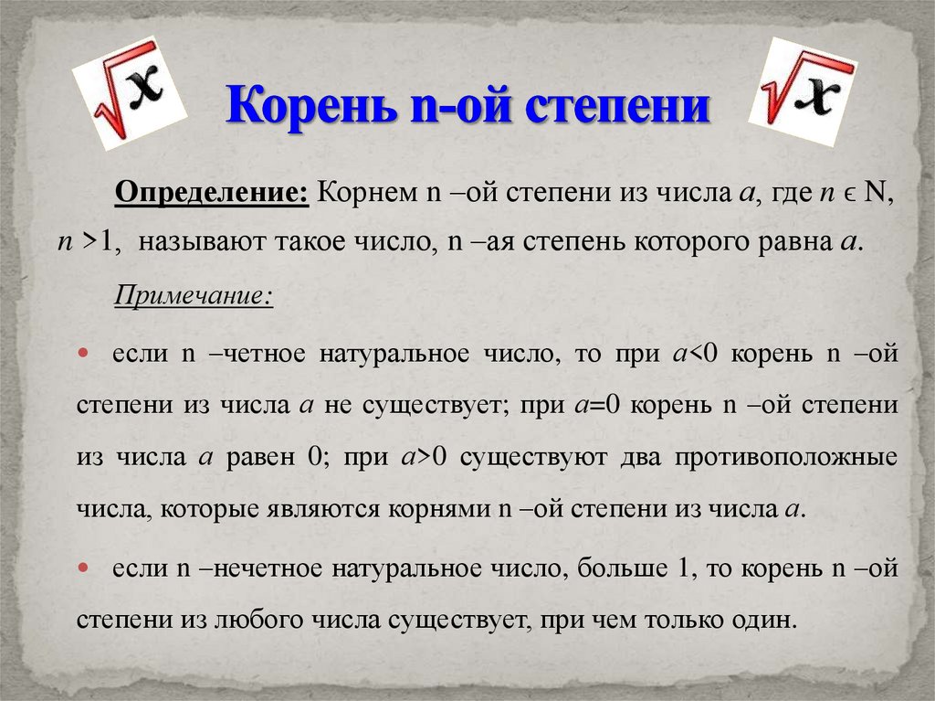 4. Степень корня. Если а≥0, n ϵ N, k ϵ N n>1, то
