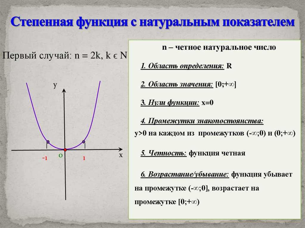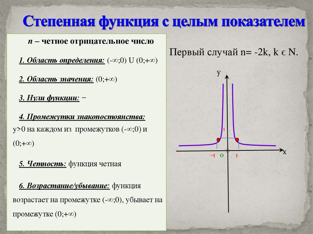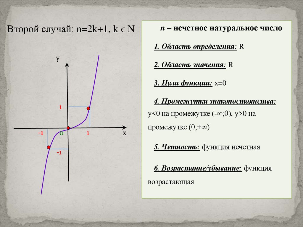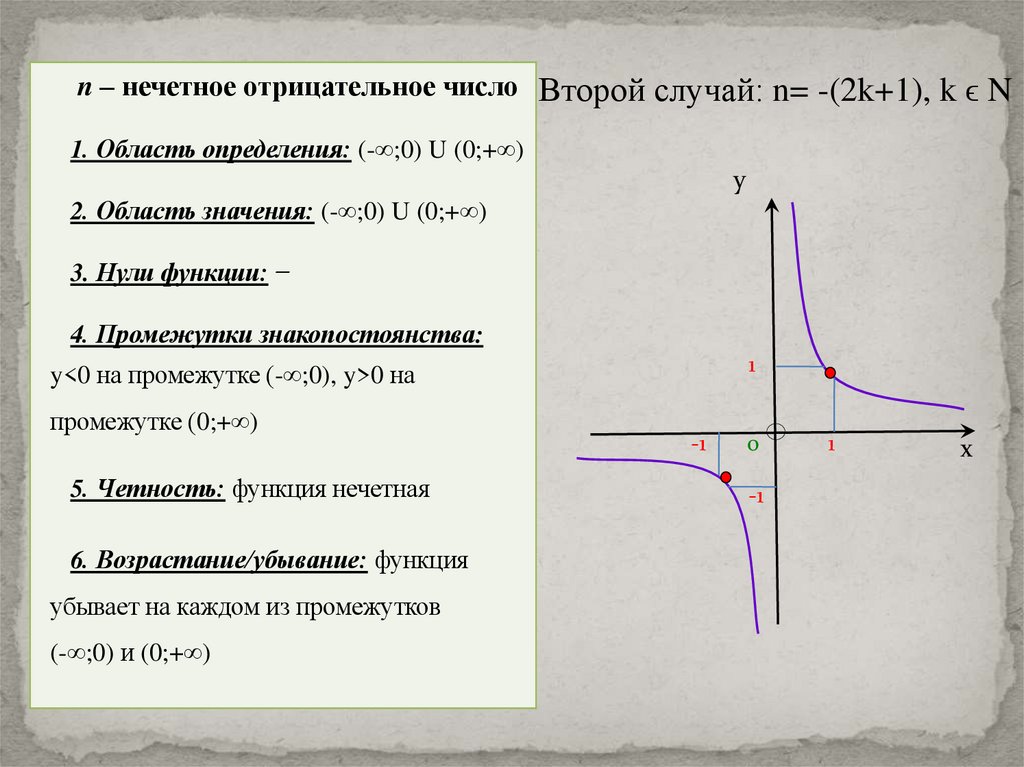n – нечетное отрицательное число Второй случай: n= -(2k+1), k ϵ N1. Область определения: (-∞;0) U (0;+∞)