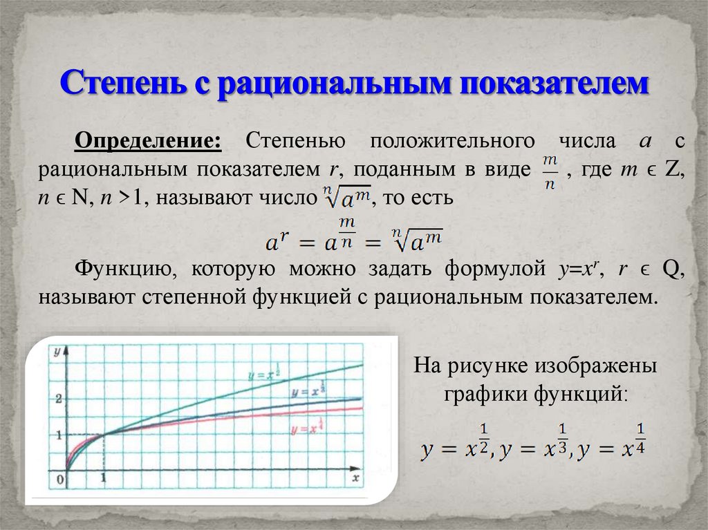 Определение: Степенью положительного числа а срациональным показателем r, поданным в виде , где m ϵ Z,