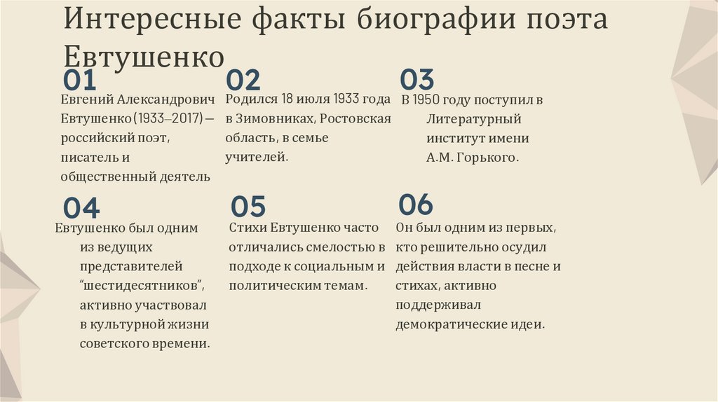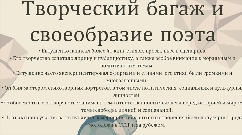 • Евтушенко часто экспериментировал с формами и стилями, его стихи были громкими и