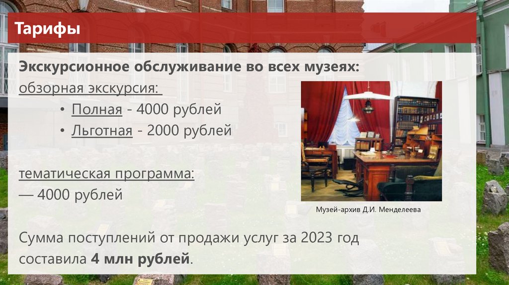 ТарифыЭкскурсионное обслуживание во всех музеях: