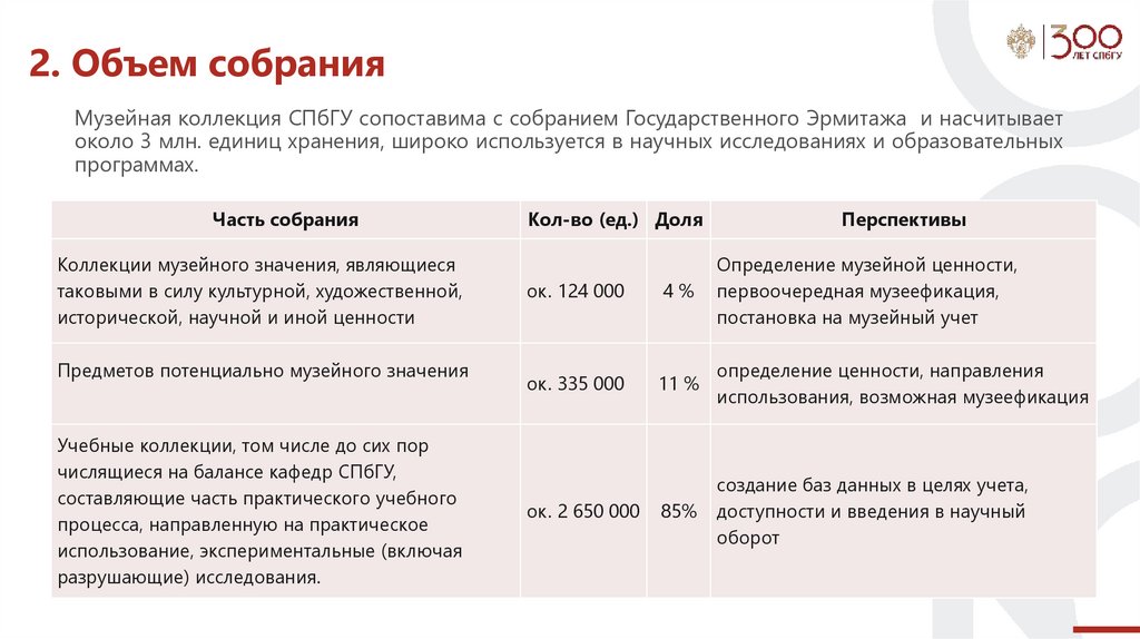 2. Объем собранияМузейная коллекция СПбГУ сопоставима с собранием Государственного Эрмитажа и насчитывает