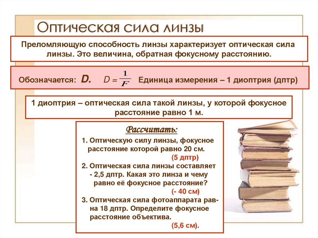 40. Фокусное расстояние линзы 0,5 м. Найти её оптическую силу?