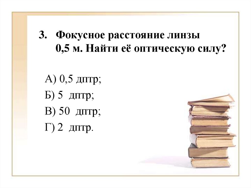 3. Фокусное расстояние линзы0,5 м. Найти её оптическую силу?