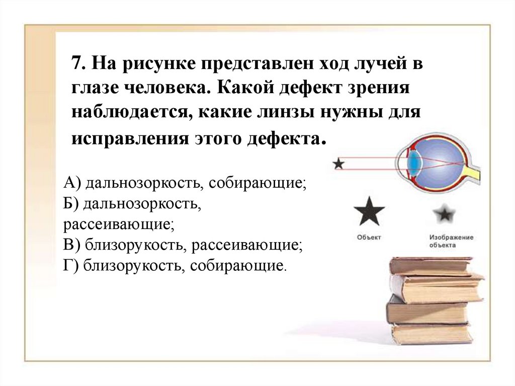44. 7. На рисунке представлен ход лучей в глазе человека. Какой дефект зрения наблюдается, какие линзы нужны для исправления этого