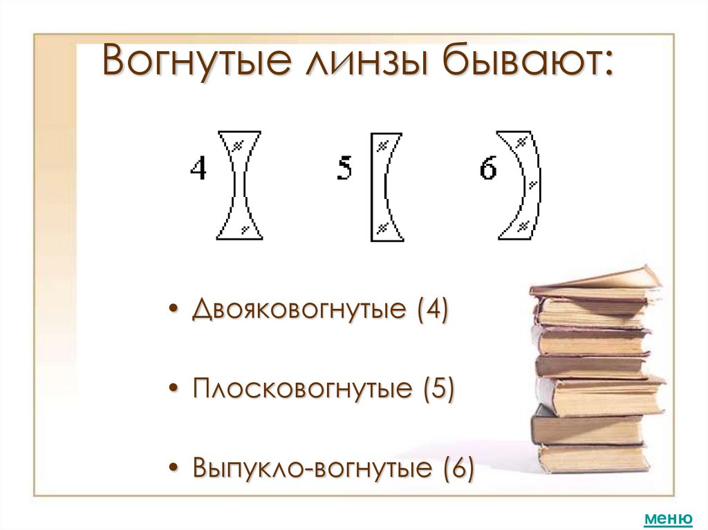 Вогнутые линзы бывают:• Двояковогнутые (4)