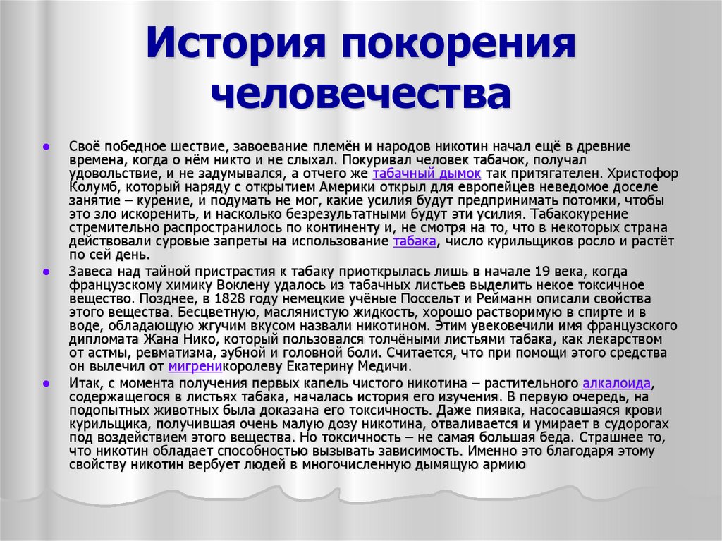 Своё победное шествие, завоевание племён и народов никотин начал ещё в древниевремена, когда о нём никто и не слыхал. Покуривал человек табачок, получал