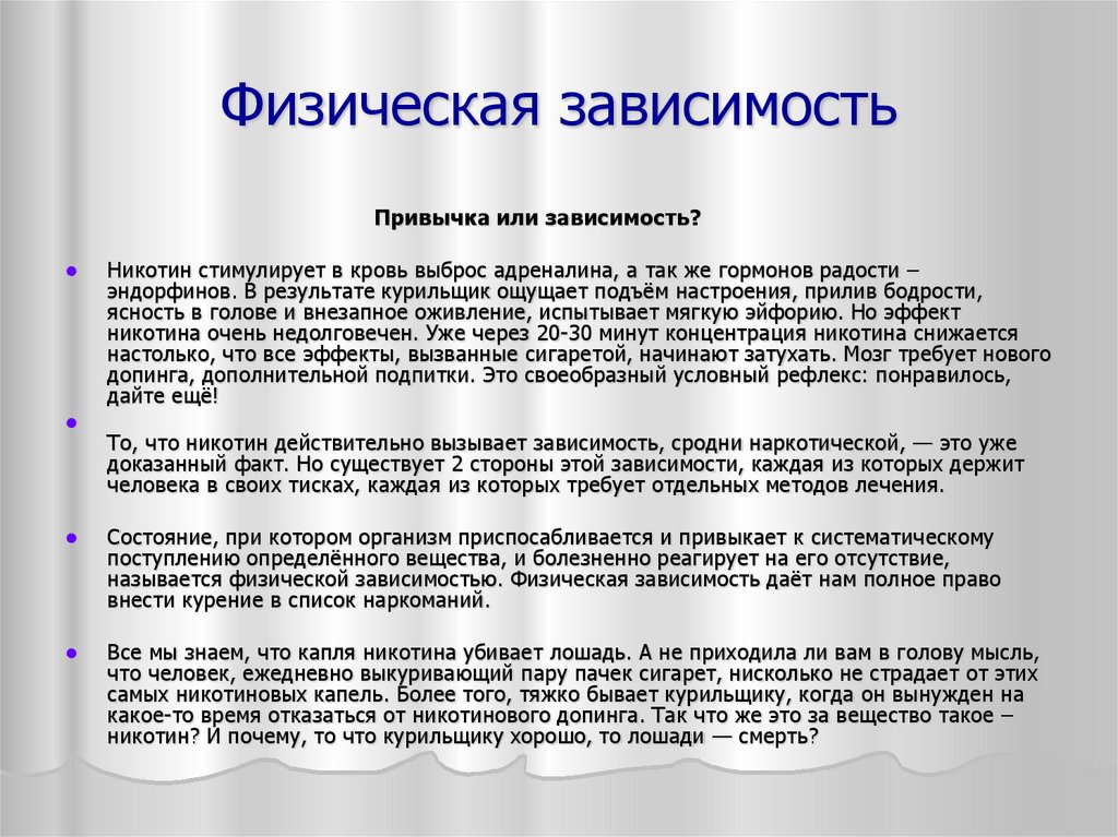 Привычка или зависимость?Никотин стимулирует в кровь выброс адреналина, а так же гормонов радости –