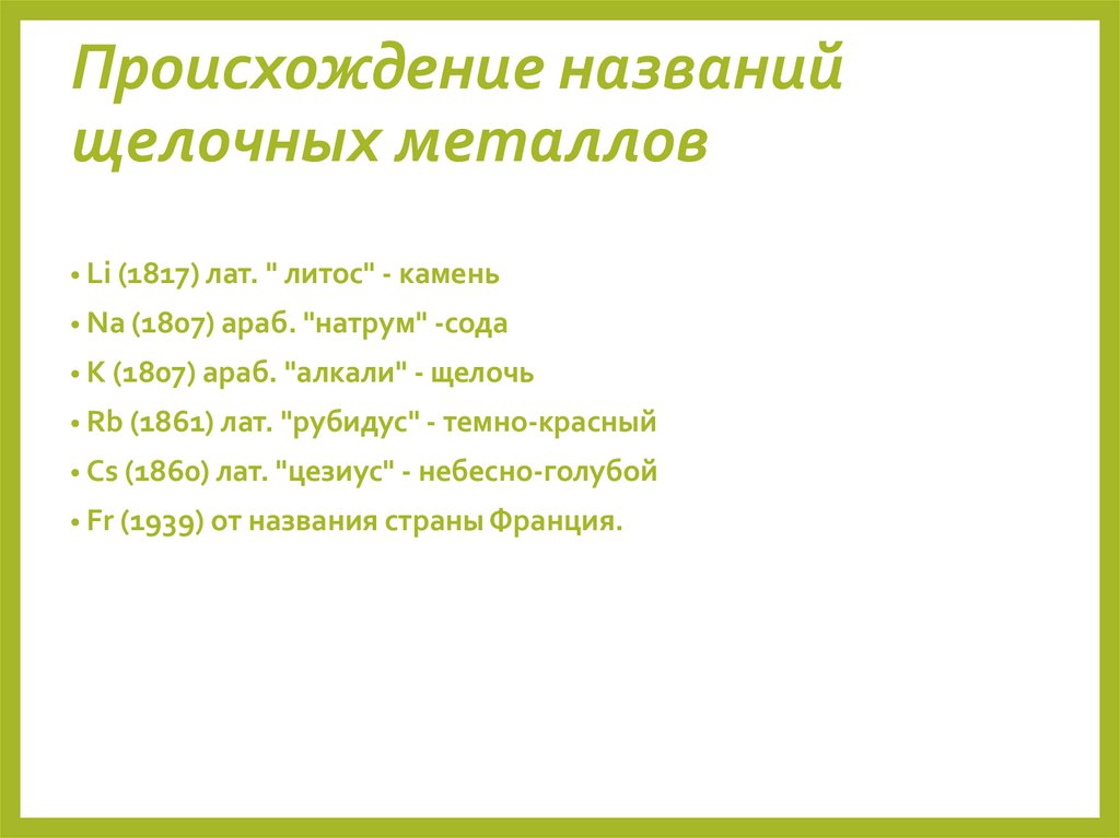 • Li (1817) лат. " литос" - камень• Na (1807) араб. "натрум" -сода