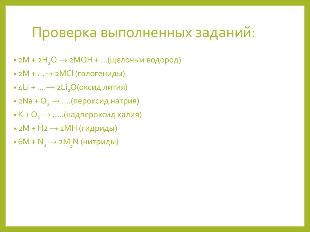 • 2М + 2H2O → 2МOH + …(щелочь и водород)• 2М + …→ 2МCl (галогениды)