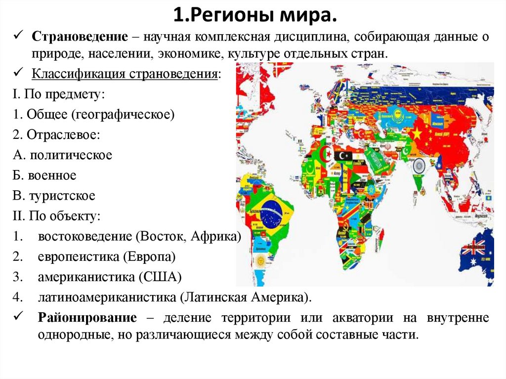 1.Регионы мира.Страноведение – научная комплексная дисциплина, собирающая данные о