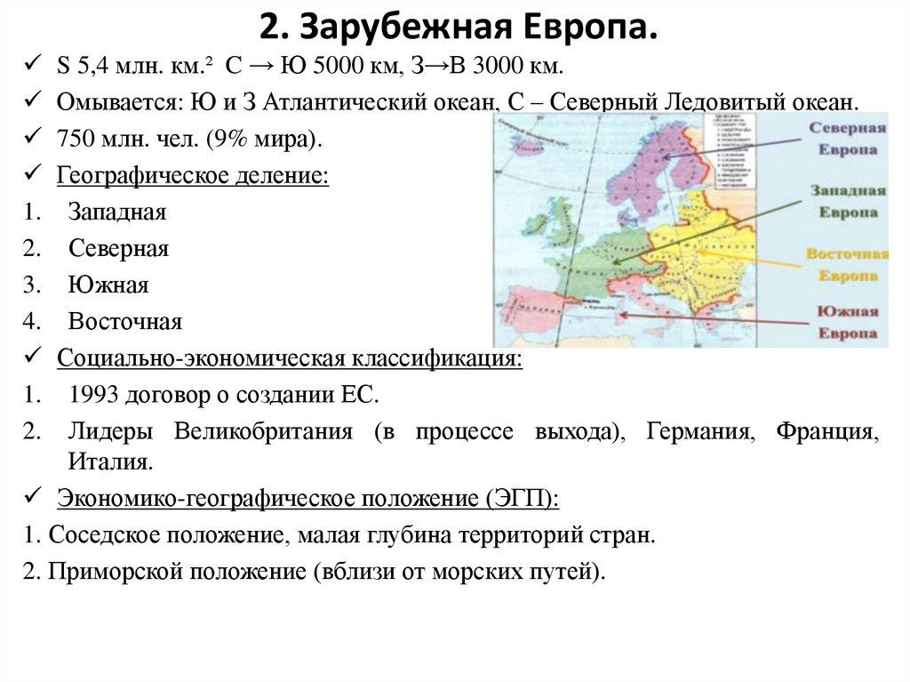 2. Зарубежная Европа.S 5,4 млн. км.² C → Ю 5000 км, З→В 3000 км.