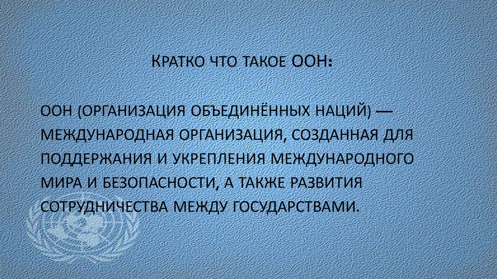 КРАТКО ЧТО ТАКОЕ ООН:ООН (ОРГАНИЗАЦИЯ ОБЪЕДИНЁННЫХ НАЦИЙ) —