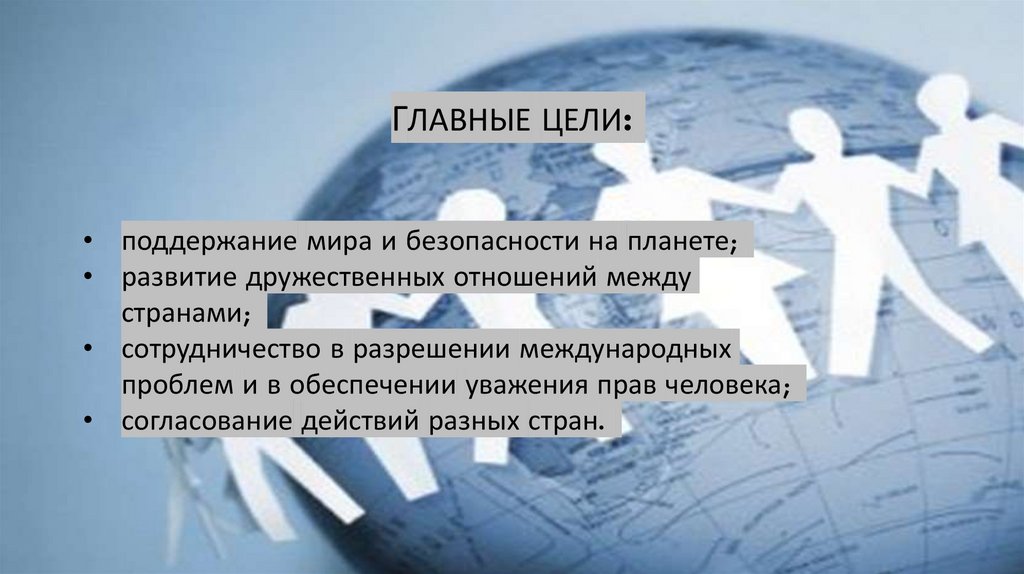 ГЛАВНЫЕ ЦЕЛИ:• поддержание мира и безопасности на планете;