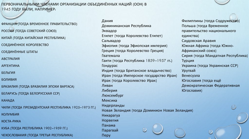 ПЕРВОНАЧАЛЬНЫМИ ЧЛЕНАМИ ОРГАНИЗАЦИИ ОБЪЕДИНЁННЫХ НАЦИЙ (ООН) В1945 ГОДУ БЫЛИ, НАПРИМЕР: