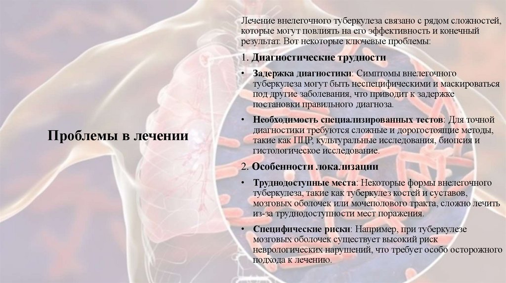 Лечение внелегочного туберкулеза связано с рядом сложностей,которые могут повлиять на его эффективность и конечный