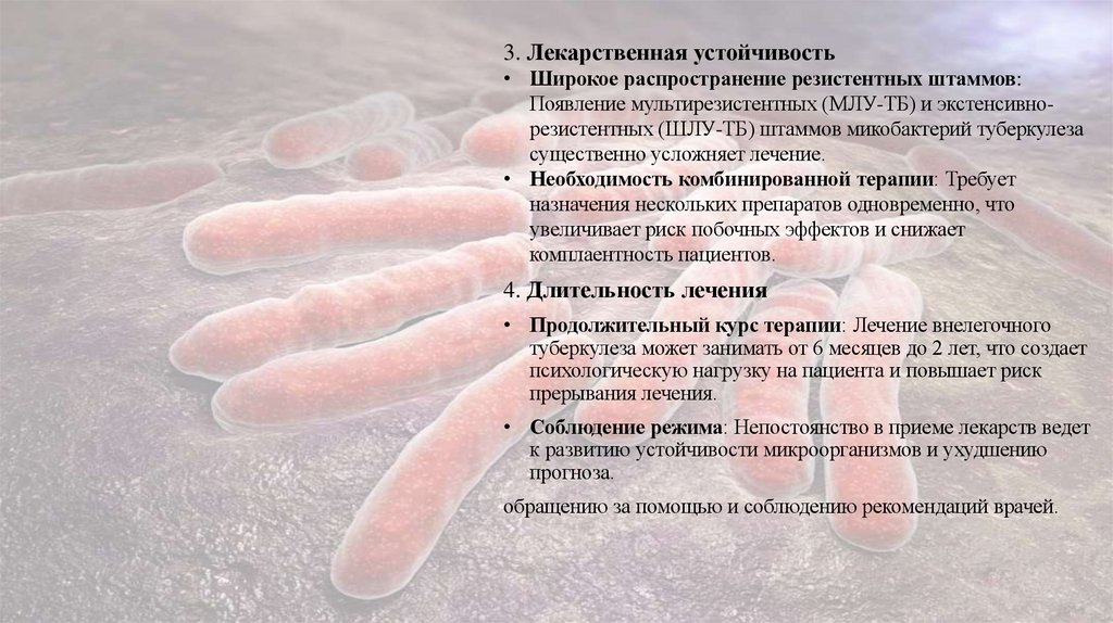 • Проблемы в лечении: Резистентность к препаратам, осложнения, доступность лечения.