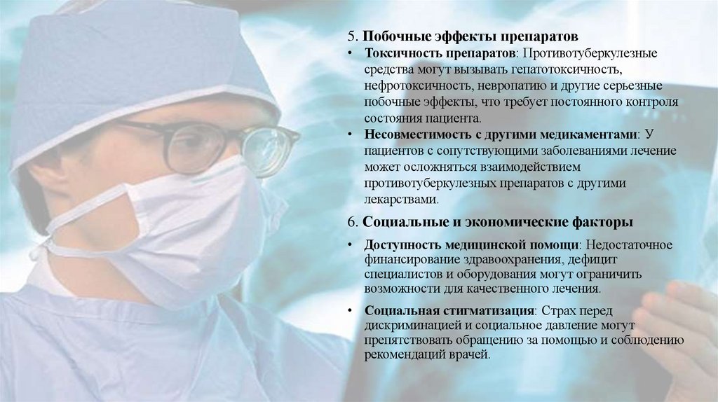 5. Побочные эффекты препаратов• Токсичность препаратов: Противотуберкулезные