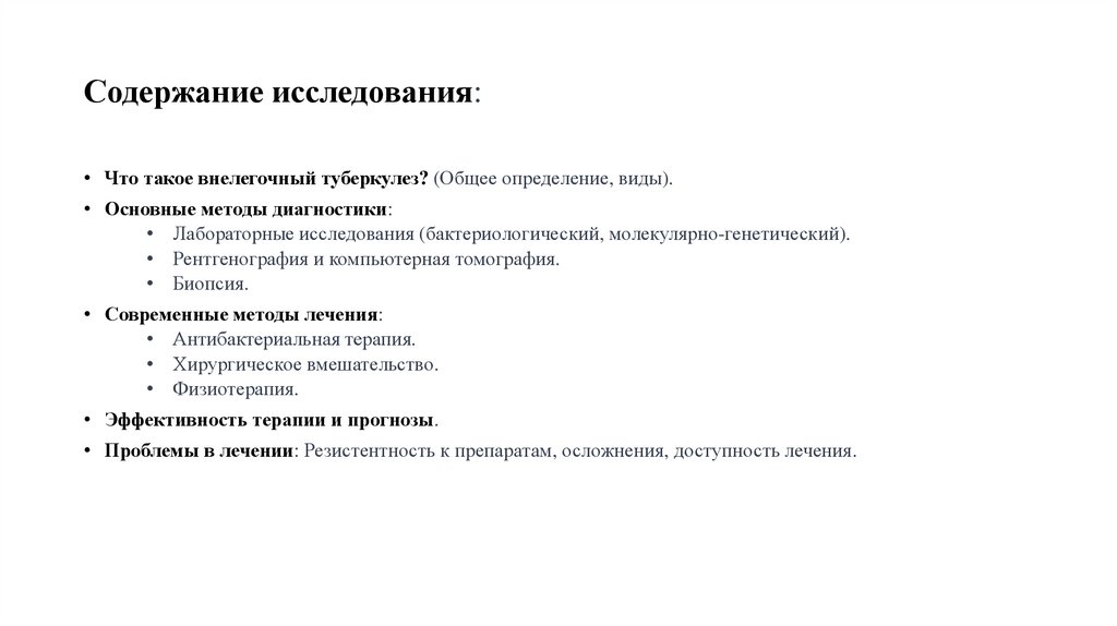 Содержание исследования:• Что такое внелегочный туберкулез? (Общее определение, виды).