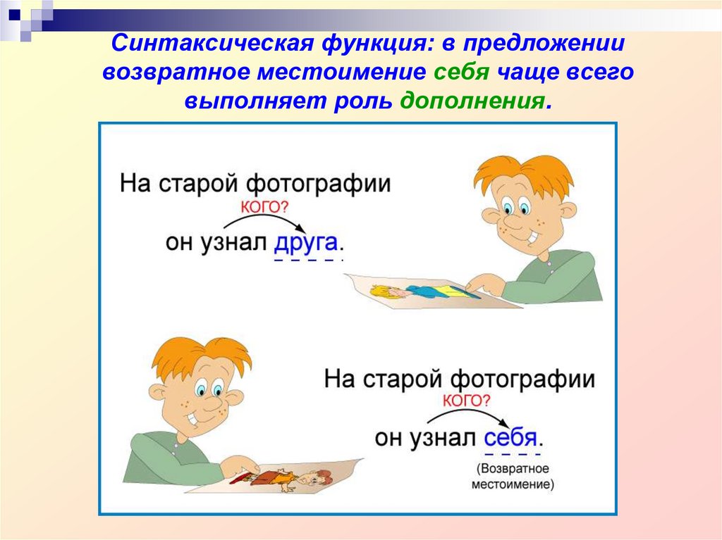 13. Синтаксическая функция: в предложении возвратное местоимение себя чаще всего выполняет роль дополнения.