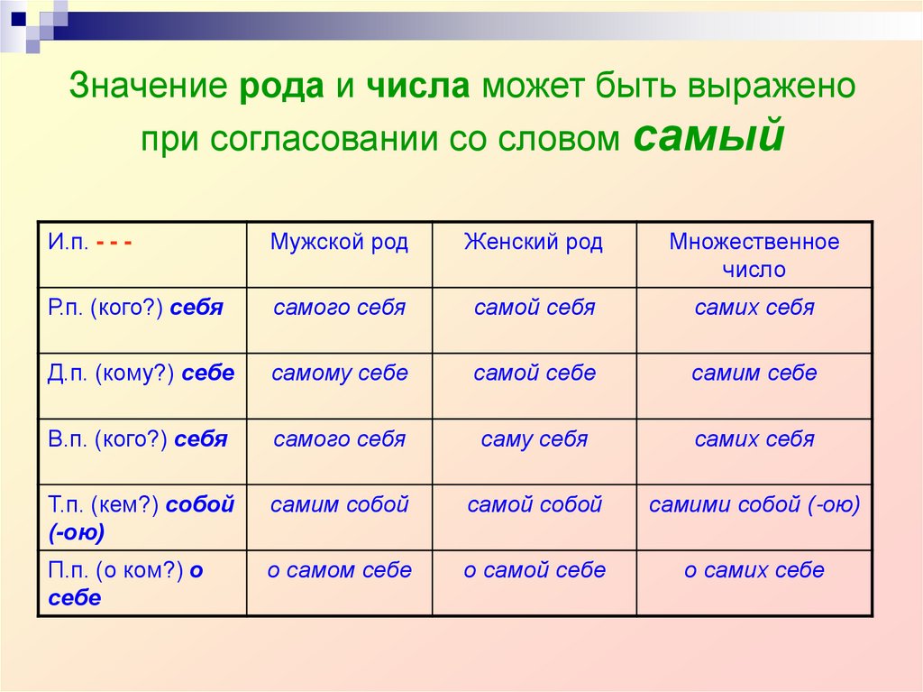 15. Значение рода и числа может быть выражено при согласовании со словом самый