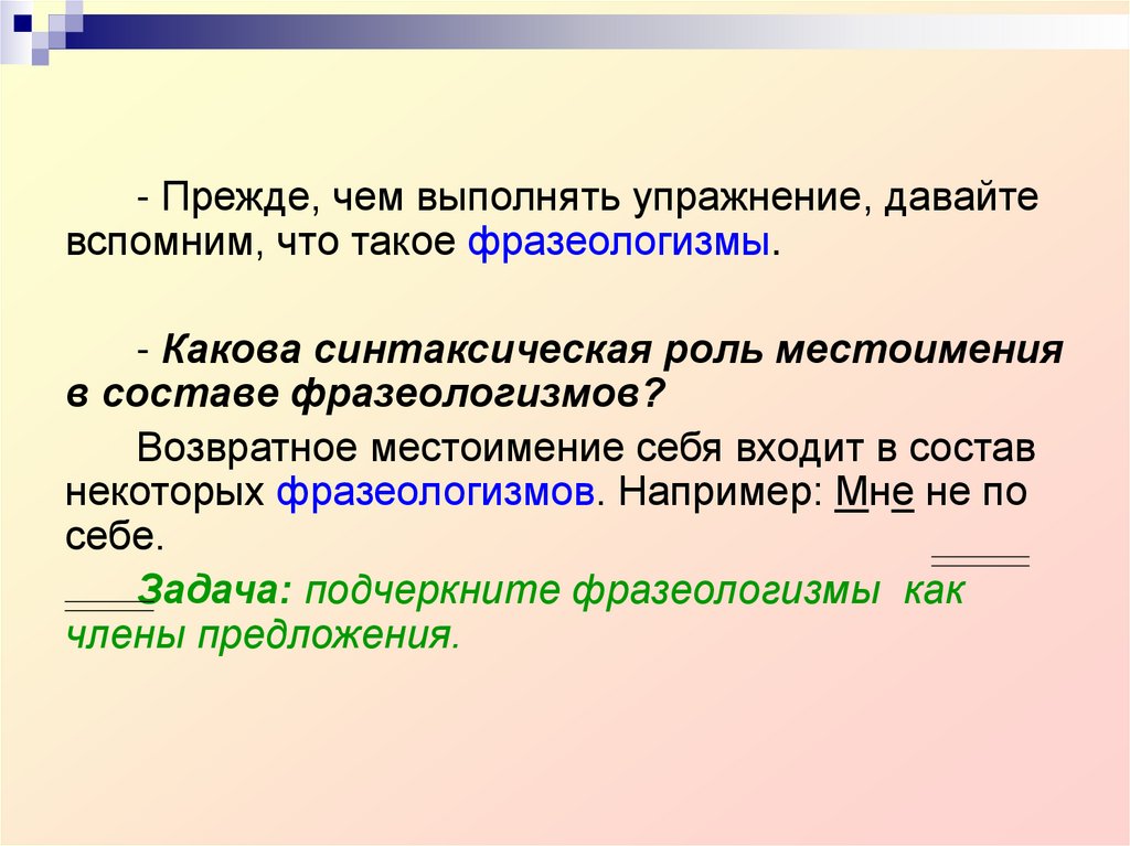 Задача: подчеркните фразеологизмы как