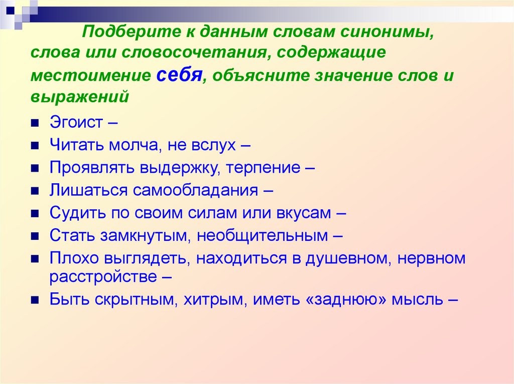 21. Подберите к данным словам синонимы, слова или словосочетания, содержащие местоимение себя, объясните значение слов и выражений